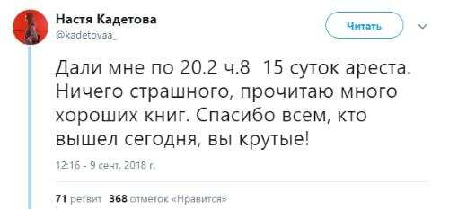 Отметим, что максимальный срок ареста по вмененной Кадетовой статье (Повторное нарушение установленного порядка организации либо проведения собрания, митинга, демонстрации, шествия или пикетирования) составляет 30 суток.