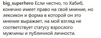 "Если честно, то Хабиб, конечно, имеет право на своё мнение, но лексикон и форма, в которой он это мнение выражает, на мой взгляд, не соответствует статусу взрослого мужчины и публичной личности", - заявил пользователь с ником big_superhero.