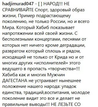 При этом пользователь с ником hadjimurad047 призвал не сравнивать пропагандируемый Хабибом Нурмагомедовым здоровый образ жизни с тем, о чем поют в своих песнях современные популярные исполнители.