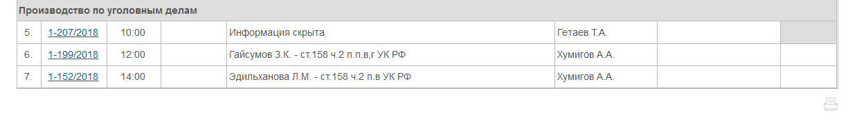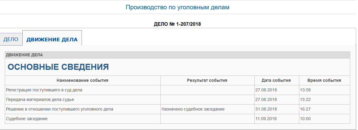 Всего 11 сентября Шалинский горсуд рассматривал три уголовных дела, два из них - дела о краже. Информация о подсудимых и вмененных им статьях УК РФ в карточке дела №1-207/2018 скрыта. Согласно данным о движении дела №1-207/2018, оно поступило в суд 27 августа, а 31 августа было назначено судебное заседание, которое состоялось 11 сентября. Результат слушания в соответствующей графе не обозначен.