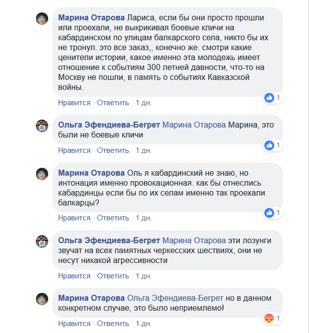 В ходе дискуссии пользователь Марина Отарова осудила участников похода за "боевые кличи на кабардинском" в балкарском селе. "Эти лозунги звучат на всех памятных черкесских шествиях, они не несут никакой агрессивности", - возразила Бегрет. Отарова признала, что не знает точного значения лозунгов, но назвала их неприемлемыми "в данном конкретном случае".