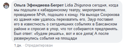 Хаути Сохроков после конгресса в Нальчике уклонился от конкретного ответа на вопрос о позиции МЧА, рассказала пользователь Facebook Ольга Эфендиева-Бегрет. "Когда мы подошли к кабардинскому театру, мероприятие, проводимое МЧА, подошло к концу. На выходе Сохрокова из здания нам удалось перехватить его, Заур поставил его в известность о сегодняшних событиях в Баксанском районе и спросил в упор, что тот собирается предпринять. Был ответ: "Будем решать", вот и все дела", - написала она в комментарии к записи Заура Жемухи, опубликованной 19 сентября.