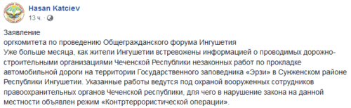 Заявление оргкомитета по проведению общегражданского форума опубликовал 24 сентября на своей странице в Facebook представитель Совета молодежных организаций Ингушетии Хасан Кациев.