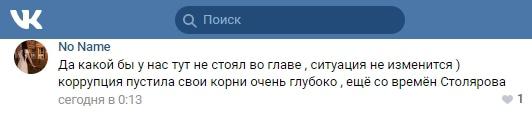 "Да какой бы у нас тут не стоял во главе, ситуация не изменится. Коррупция пустила свои корни очень глубоко ещё со времен Столярова",- написал No Name в соцсети "ВКонтакте".