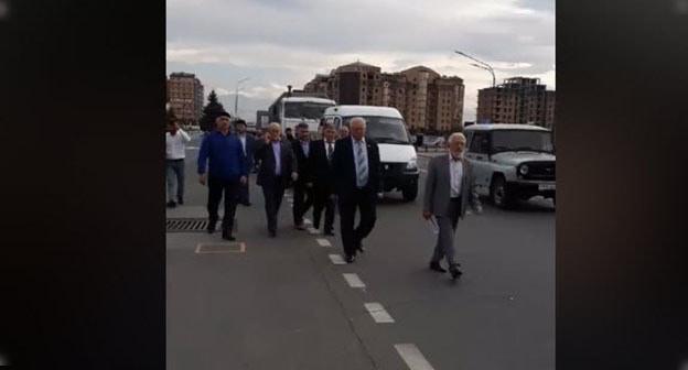 Видеозапись с идущими к людям депутатами опубликовала сегодня в 15.20 на своей странице в Facebook участница акции Анжела Матиева. На записи видео, как по пустой дороге идет группа мужчин в костюмах, они проходят через оцепление силовиков и направляются в толпу людей. Запись обрывается на моменте, когда люди расступаются перед мужчинами.