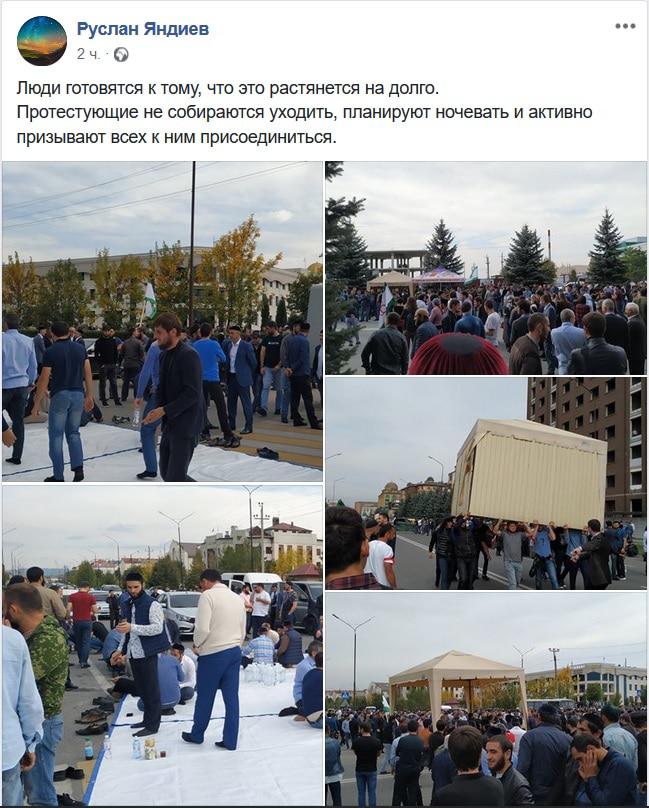 "Подвозятся столы, стулья, хотят создать хоть какие-то условия", - рассказал находящийся на акции протеста пользователь Facebook Ахмед Бузуртанов, опубликовав в 14.04 мск видео машины, подъехавшей к протестующим.