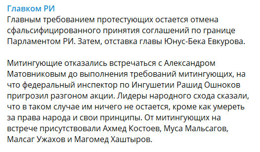 От митингующих на встрече присутствовали Ахмед Костоев, Муса Мальсагов, Малсаг Ужахов и Магомед Хаштыров. Участники переговоров, в частности, федеральный инспектор по Ингушетии Рашид Ошноков, прямо обсуждали угрозы разгона акции, но представители протестующих подтвердили главные требования - отмена сфальсифицированного решения парламента о ратификации соглашения о границе и отставка главы республики, говорится в сообщении Telegram-канала "Главком РИ".