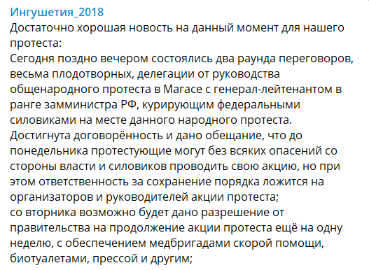 Источник, знакомый с результатом прошедших переговоров, оценил их как "весьма плодотворные". "Дано обещание, что до понедельника протестующие могут без всяких опасений со стороны власти и силовиков проводить свою акцию, но при этом ответственность за сохранение порядка ложится на организаторов и руководителей акции протеста; со вторника, возможно, будет дано разрешение от правительства на продолжение акции протеста еще на одну неделю, с обеспечением медбригадами скорой помощи, биотуалетами, прессой и другим", - говорится в сегодняшнем сообщении Тelegram-канала "Ингушетия_2018".