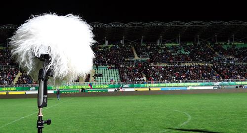 Хабиб Нурмагомедов пришел на стадион в сопровождении чиновников. У кромки футбольного поля была установлена небольшая сцена.