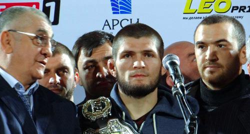 В конце августа дагестанский боец Хабиб Нурмагомедов и ирландец Конор Макгрегор вступили в заочную перепалку. Макгрегор назвал трусом Абдулманапа Нурмагомедова, отца и тренера своего оппонента, объяснив это похвалой Абдулманапа в адрес Кадырова. По мнению ирландца, на самом деле отец его соперника из Дагестана боится Рамзана Кадырова, которого Макгрегор назвал "диктатором". После этого глава Минпечати республики Джамбулат Умаров поддержал спортсмена Хусейна Халиева, потребовавшего от ирландского бойца извиниться.