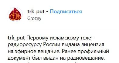 "Первому исламскому телерадиоресурсу России выдана лицензия на эфирное вещание. Ранее профильный документ был выдан на радиовещание", - говорится в сообщении от 8 октября, размещенном на станице ТРК "Путь" в соцсети Instagram.
