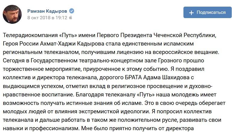 "Благодаря телеканалу "Путь" наша молодежь имеет возможность получать истинные знания об исламе. Это в свою очередь оберегает молодых людей от влияния экстремисткой идеологии. Я попросил коллектив телеканала и дальше работать в таком же положительном русле, развивать свои навыки и профессионализм", - написал 8 октября в своем аккаунте "ВКонтакте" глава Чечни Рамзан Кадыров.