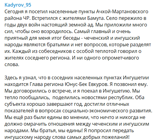 Позднее сообщение о встрече с Кадыровым опубликовал и глава Ингушетии. Встреча произошла в ингушском селении Аршты, указал Юнус-Бек Евкуров.