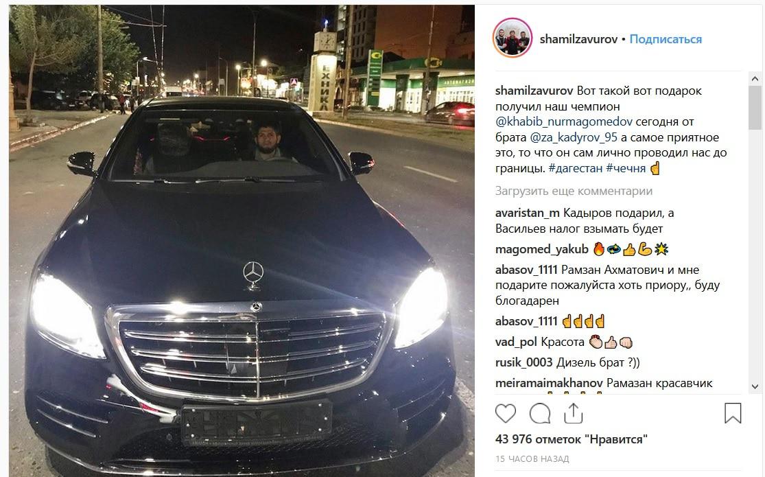 "Вот такой вот подарок получил наш чемпион Хабиб Нурмагомедов сегодня от брата Рамзана Кадырова. Самое приятное, что он лично проводил нас до границы", – написал в своем аккаунте в Instagram Шамиль Завуров, опубликовав фото машины, за рулем которой сидит спортсмен.