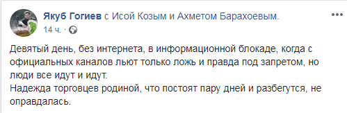 "Девятый день, без интернета, в информационной блокаде, когда с официальных каналов льют только ложь и правда под запретом, но люди все идут и идут", - написал 13 октября в 19.43 мск на своей странице в соцсети Facebook Якуб Гогиев.
