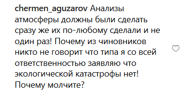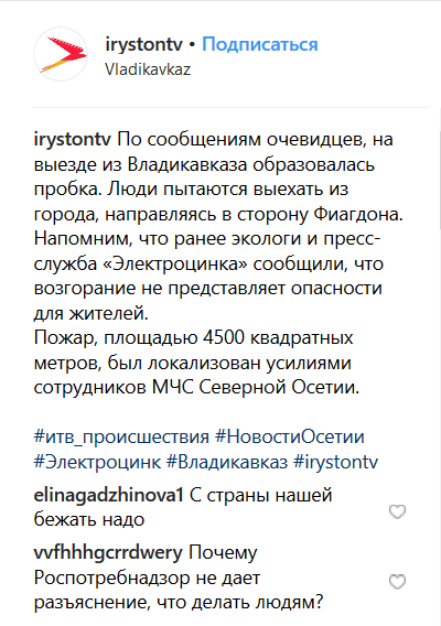 Эта публикация стала одним из наиболее обсуждаемых постов об "Электроцинке" в Instagram, набрав за два часа более 150 комментариев. Участники обсуждения возмущены тем, что власти не распространяют информацию о мерах индивидуальной защиты. К заявлениям о том, что дым не представляет никакой опасности, жители Владикавказа относятся с недоверием.