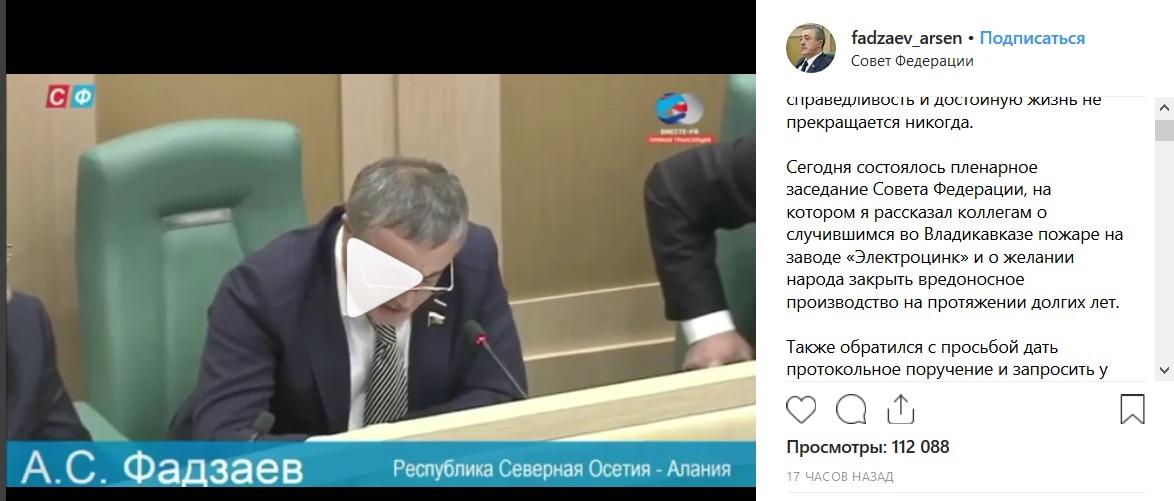 По словам сенатора от Северной Осетии Арсена Фадзаева, в ходе пленарного заседания Совета федерации он рассказал о пожаре на "Электроцинке" и желании жителей республики закрыть завод.
