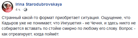 "Странный какой-то формат приобретает ситуация. Ощущение, что Кадыров уже не понимает, что Ингушетия - не Чечня, и здесь никто не собирается вставать по стойке "смирно" по любому его слову. Вопрос - как отреагирует, когда поймёт", - написала Стародубровская.