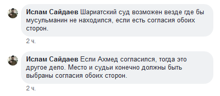 Он уточнил, что шариатский суд "возможен везде, где бы мусульманин ни находился, если есть согласие обеих сторон". "Если Ахмед [Барахоев] согласился, тогда это другое дело. Место и судьи, конечно, должны быть выбраны с согласия обеих сторон", - написал Ислам Сайдаев.