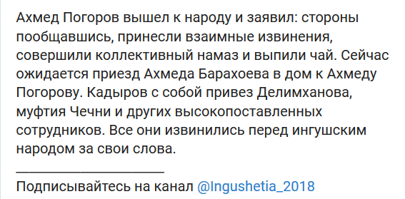 Выйдя к собравшимся после разговора, Ахмед Погоров сообщил, что стороны "принесли взаимные извинения", при этом Кадыров и члены его делегации "извинились перед ингушским народом за свои слова", говорится в сообщении Telegram-канала "Ингушетия_2018".