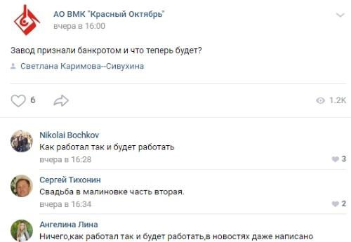 Новость о банкротстве завода была размещена 8 октября в независимой группе "АО ВМК "Красный Октябрь" в социальной сети "ВКонтакте".