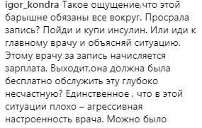 "Такое ощущение, что этой барышне обязаны все вокруг. […] Пойди и купи инсулин. Или иди к главному врачу и объясняй ситуацию. Этому врачу за запись начисляется зарплата. Выходит, она должна была бесплатно обслужить эту глубоко несчастную?" - отметил igor_kondra.