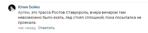 "Это трасса Ростов-Ставрополь, вчера вечером там невозможно было ехать, лед стоял сплошной, пока "посыпалка" не проехала", - написала в комментарии пользователь Юлия Бойко.