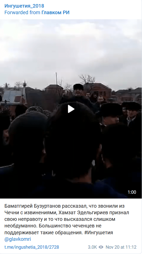 Видеозапись выступления Бузуртанова на сходе в Экажево была опубликована в Telegram-каналах "Главком РИ" и "Ингушетия_2018". "Я позвонил и сообщил, что я нахожусь в Черноречье. Я ему сказал, что если у него есть дух, то он должен разобраться со мной. Я направился в Грозный, я не боялся того, что меня могут убить. Но он отключил телефон и больше не поднял. Позже он перезвонил и сказал, что раскаялся за свои слова, что сказал неправильные вещи и что больше таких разговоров не будет", - перевел слова Бузуртанова корреспондент "Кавказского узла".