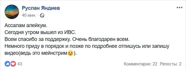 "Сегодня утром вышел из ИВС. Всем спасибо за поддержку. Очень благодарен всем. Немного приду в порядок и позже по подробнее отпишусь или запишу видео", - написал на своей странице в соцсети Facebook Руслан Яндиев.