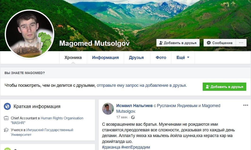 При этом на странице Магомеда Муцольгова сегодня размещен перепост записи председателя региональной общественной организации "Выбор Ингушетии" Исмаила Нальгиева, поздравляющего активистов с возвращением.
