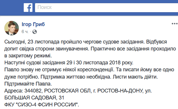 В конце июля Северо-Кавказский окружной военный суд вернул в прокуратуру дело Павла Гриба из-за допущенной обвинением процессуальной ошибки. Украинец был обвинен по редакции уголовного закона, которая не действовала на момент вменяемого ему деяния. Прокуратура изменила редакцию статьи, в остальном обвинительное заключение по делу Гриба осталось неизменным. 7 ноября суд продлил срок ареста до 24 апреля 2019 года.