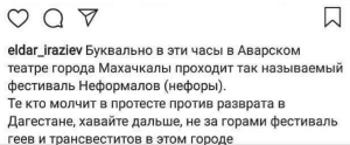 "Буквально в эти часы в Аварском театре города Махачкалы проходит так называемый фестиваль Неформалов (нефоров). Те, кто молчит в протесте против разврата в Дагестане, хавайте дальше, не за горами фестиваль геев и трансвеститов в этом городе", - говорится в публикации Иразиева от 25 ноября, которую приводит РИА "Дербент".