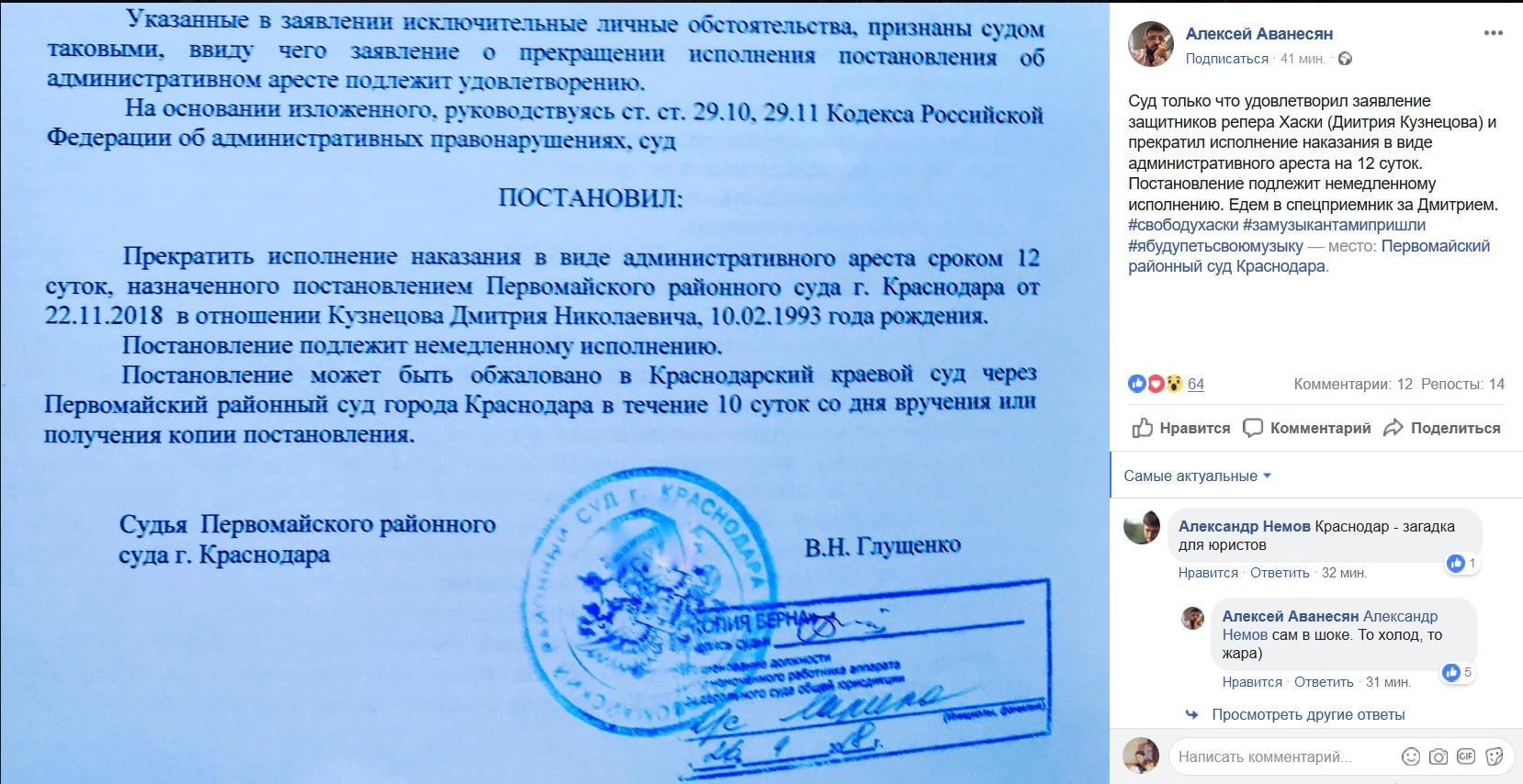 "Суд удовлетворил заявление защитников рэпера Хаски (Дмитрия Кузнецова) и прекратил исполнение наказания в виде административного ареста на 12 суток. Постановление подлежит немедленному исполнению", - написал сегодня адвокат Алексей Аванесян на своей странице в Facebook.
