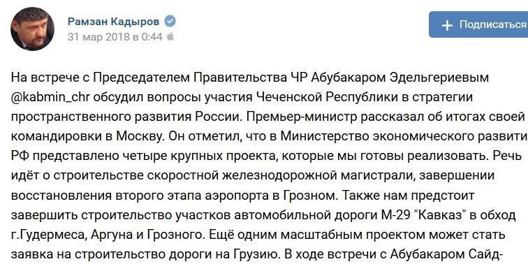 В Минэкономразвития РФ представлены четыре крупных проекта, которые готово реализовать руководство республики, написал в своем аккаунте в соцсети "ВКонтакте" Рамзан Кадыров по итогам встречи Абубакаром Эдельгериевым, возглавлявшим в тот момент правительство Чеченской Республики. "Речь идет о строительстве скоростной железнодорожной магистрали, завершении восстановления второго этапа аэропорта в Грозном. Также нам предстоит завершить строительство участков автомобильной дороги М-29 "Кавказ" в обход Гудермеса, Аргуна и Грозного. Еще одним масштабным проектом может стать заявка на строительство дороги на Грузию", - отметил Кадыров.