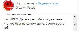 "Да вся республика уже знает, кто это был на самом деле. Зачем врать-то?!" - пишет пользователь под ником nasi88921 в группе "chp_groznyy" соцсети Instagram.