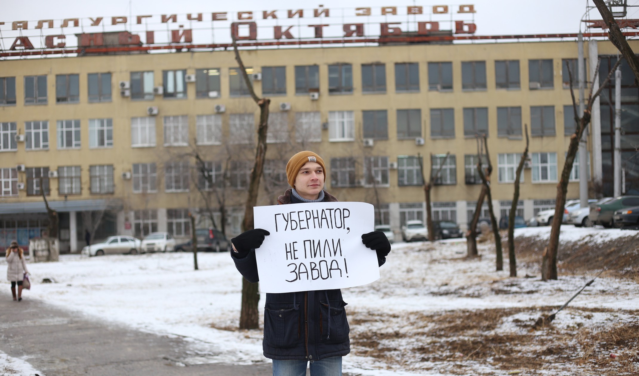 Сторонник Навального Виталий Мордовцев провел одиночный пикет, призвав не доверять обещаниям властей о дальнейшей работе металлургического комбината "Красный Октябрь". Рабочие волгоградского завода сообщили, что получили уведомления о возможном сокращении.