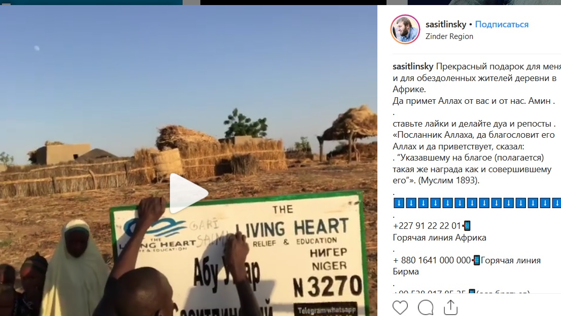 Так, в аккаунте в instagram Абу Умар Саситлинский 16 декабря разместил видеозапись об открытии очередного колодца, в которой отметил, что это "прекрасный подарок для него и для обездоленных жителей деревни в Африке". На видео несколько человек держат плакат с именем Саситлинского и качают воду из нового колодца.