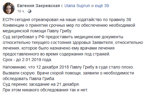 "Суд затребовал у РФ предоставить медицинские документы относительно текущего состояния здоровья Заявителя, относительно лечения, которое было назначено ему врачами, лечения, предоставленного во время содержания под стражей. Срок - до 2.01.2019 года", - сообщила Евгения Закревская, уточнив, что после 12 декабря "никакого обследования" Грибу не проводилось.
