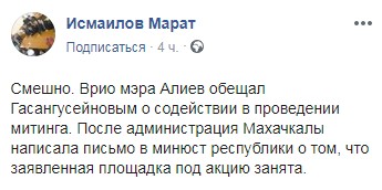 "Смешно. Врио мэра Алиев обещал Гасангусейновым содействие в проведении митинга. После администрация Махачкалы написала письмо в Минюст республики о том, что заявленная площадка под акцию занята", - прокомментировал Марат Исмаилов.