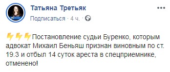 "Постановление судьи Буренко, которым адвокат Михаил Беньяш признан виновным по ст. 19.3 и отбыл 14 суток ареста в спецприемнике, отменено!" - написала Татьяна Третьяк на своей странице в Facebook.