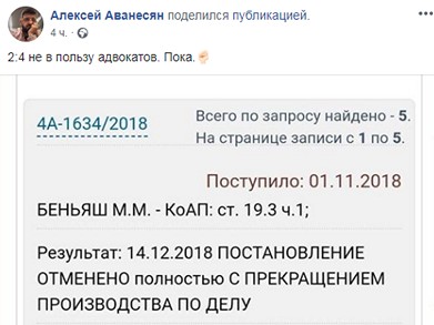 "2:4 не в пользу адвокатов. Пока", - прокомментировал это решение на своей странице в Facebook адвокат Алексей Аванесян.
