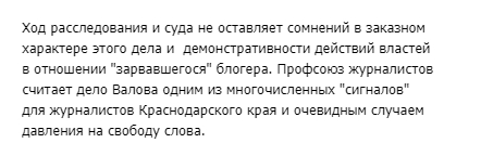 "Дело Валова является одним из многочисленных "сигналов" для журналистов Краснодарского края и очевидным случаем давления на свободу слова", - говорится в заявлении.