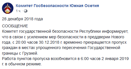 "Работа пунктов пропуска возобновится в 06.00 [05.00 мск] 2 января 2019 г. в обычном режиме", - говорится в сообщении, размещенном на странице ведомства в Facebook.