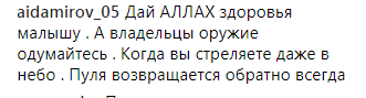 "Владельцы оружия, одумайтесь. Когда вы стреляете даже в небо. Пуля возвращается обратно всегда", - написал пользователь под ником aidamirov_05.