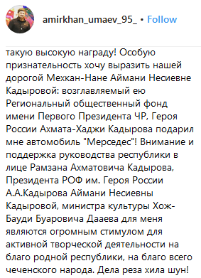 Сам Амирхан Умаев 3 января опубликовал на своей странице в Instagram фото с новым автомобилем, сообщил, что получил машину в подарок от фонда имени Ахмата Кадырова.