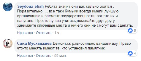 «Ребята, значит они вас сильно боятся. Поразительно .... все-таки кумыки всегда имели лучшую организацию и элемент государственности, вот это их и напугало. Просто лучше учитесь, помогайте друг другу, занимайте ключевые места, и ничего они не смогут вам сделать», - написал Seydoux Shah под заявлением кумыкских общин, опубликованном на странице пользователя Zelim Han Kumuk в Facebook.