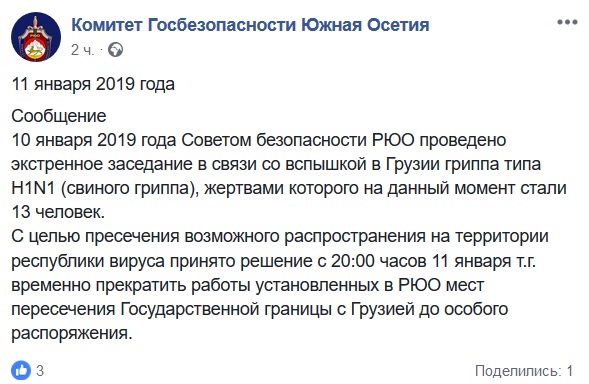 "10 января Советом безопасности РЮО проведено экстренное заседание в связи со вспышкой в Грузии гриппа типа H1N1 (свиного гриппа), жертвами которого стали 13 человек. С целью пресечения возможного распространения на территории республики вируса принято решение с 20.00 часов 11 января временно прекратить работы установленных в РЮО мест пересечения государственной границы с Грузией", - говорится в сегодняшнем сообщении, размещенном на странице КГБ Южной Осетии в Facebook.