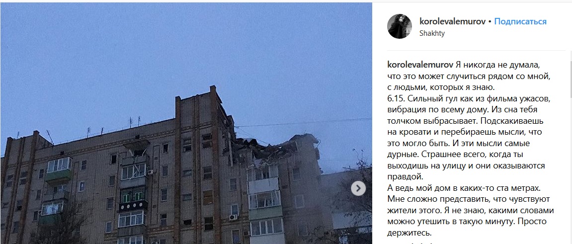 "Я никогда не думала, что это может случиться рядом со мной, с людьми, которых я знаю. 6.15. Сильный гул как из фильма ужасов, вибрация по всему дому. Из сна тебя толчком выбрасывает. Подскакиваешь на кровати и перебираешь мысли, что это могло быть. И эти мысли самые дурные. Страшнее всего, когда ты выходишь на улицу, и они оказываются правдой. А ведь мой дом в каких-то ста метрах. Мне сложно представить, что чувствуют жители этого. Я не знаю, какими словами можно утешить в такую минуту. Просто держитесь", - написала пользователь Instagram с ником korolevalemurov, разместив фото разрушенного дома.