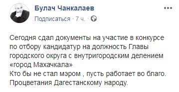 «Сегодня сдал документы на участие в конкурсе по отбору кандидатур на должность Главы городского округа с внутригородским делением «город Махачкала». Кто бы ни стал мэром, пусть работает во благо. Процветания дагестанскому народу», - написал Булач Чанкалаев.