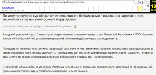 В решении суда о списании долгов жителей Чечни за газ сумма в 9 миллиардов рублей не фигурирует, сообщил 21 января "Газпром межрегионгаз Грозный". Прокуратура республики удалила сумму задолженности из пресс-релиза о судебном решении.